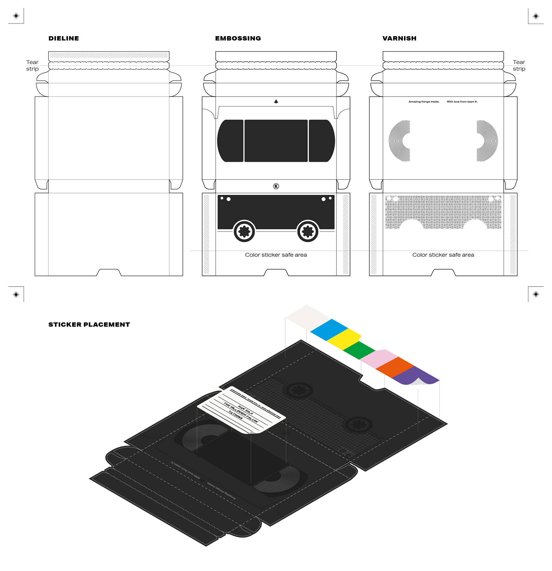 In addition, we created a font that would enable us to batch-produce shipping labels while mimicking the idea of a handwritten VHS label. In order to reduce the amount of single-use materials, the packaging serves as both primary packaging and shipping box. This added an unpredictable component to the experience: every package arrived a little bit different, carrying shipping marks and blemishes, evoking that desired feeling of sentimentality and passing of time.